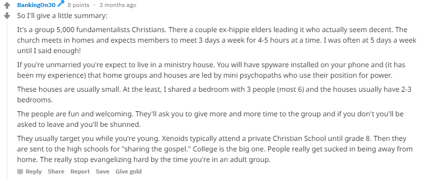 In times when I wasn't participating in the above meetings, I was expected to read the bible, study the bible, have times of prayer with god, study my christian principles class material, read christian literature, and obviously, I needed time to go to University, Study, and work a job. The schedule is grueling. They do not respect times of study, they overburden you with meetings, they make you feel pressured into working up the leadership ladder. You don't choose what house you want to live in, initially you might have an option, but if your homechurch expands, the decision of where you live is left up to leadership.